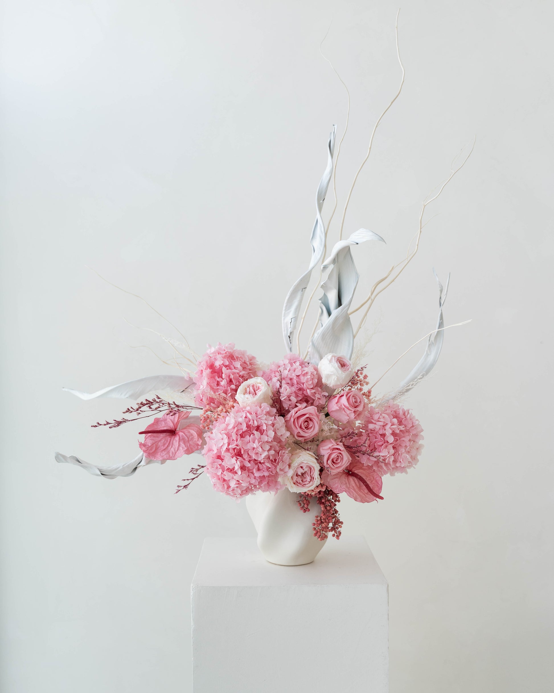 An everlasting natural preserved arrangement that lasts for years. Features two lush pink hydrangeas, three timeless bi color garden roses, three premium pink roses sculptural three Anthuriums, complemented by delicate preserved Strelitzia leaf that add depth and movement.