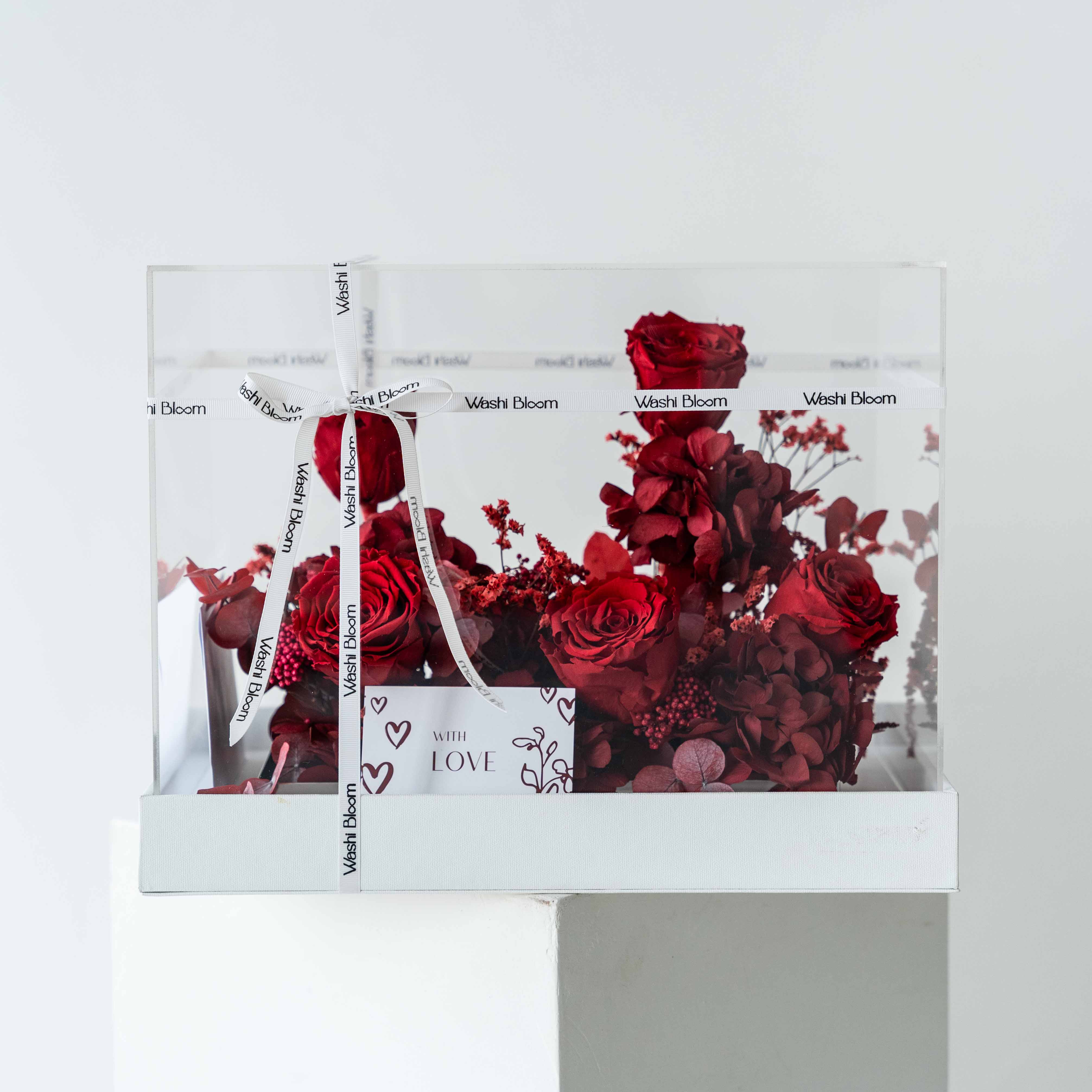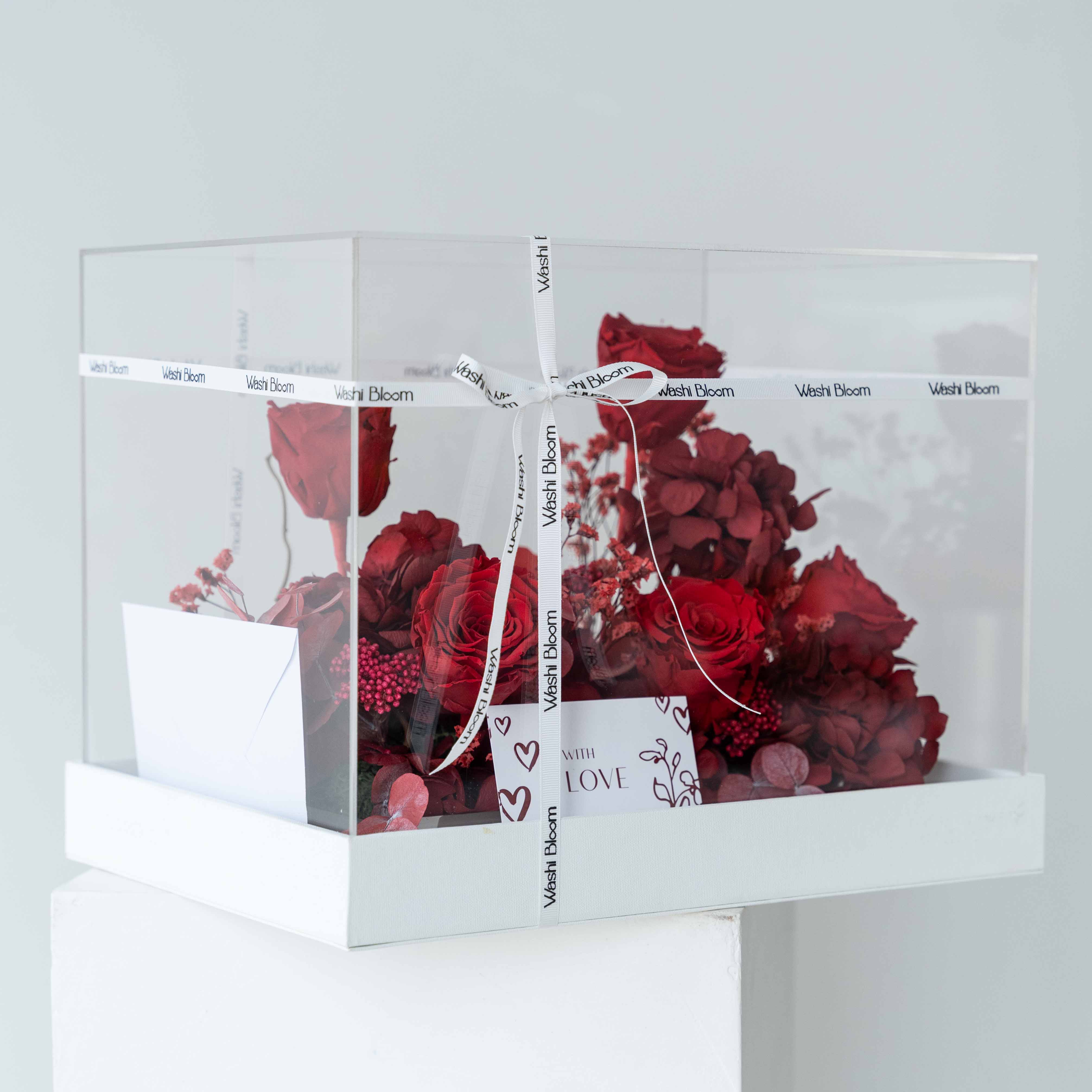 Devotion Box is a refined preserved floral arrangement designed for meaningful gifting. Deep red roses and hydrangeas are carefully arranged inside a clear acrylic display box, finished with Washi Bloom signature ribbon and detailing.