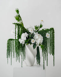 An Everlasting Natural Preserved Arrangement. A sculptural design that captures the harmony of freshness and elegance, featuring lush preserved white hydrangeas and delicate white Japanese Chrysanthemum , framed with dynamic green textures and elongated preserved accents. Cascading strands of Amaranthus flow gracefully from both sides, adding movement and drama to the piece.