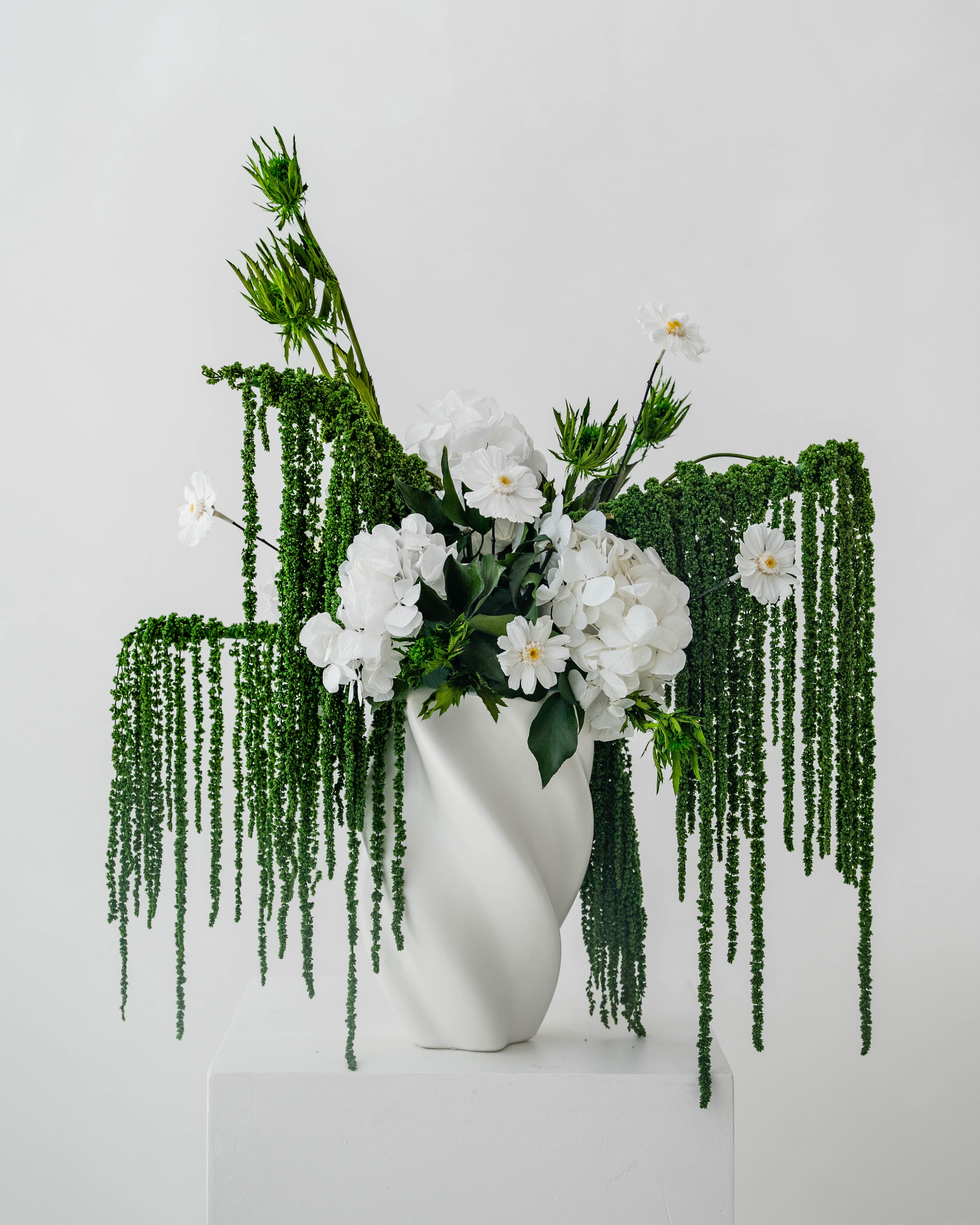 Arranged in a modern white twisted vase, the contrast between the crisp white blooms and rich greenery creates a timeless statement of natural beauty and contemporary artistry.