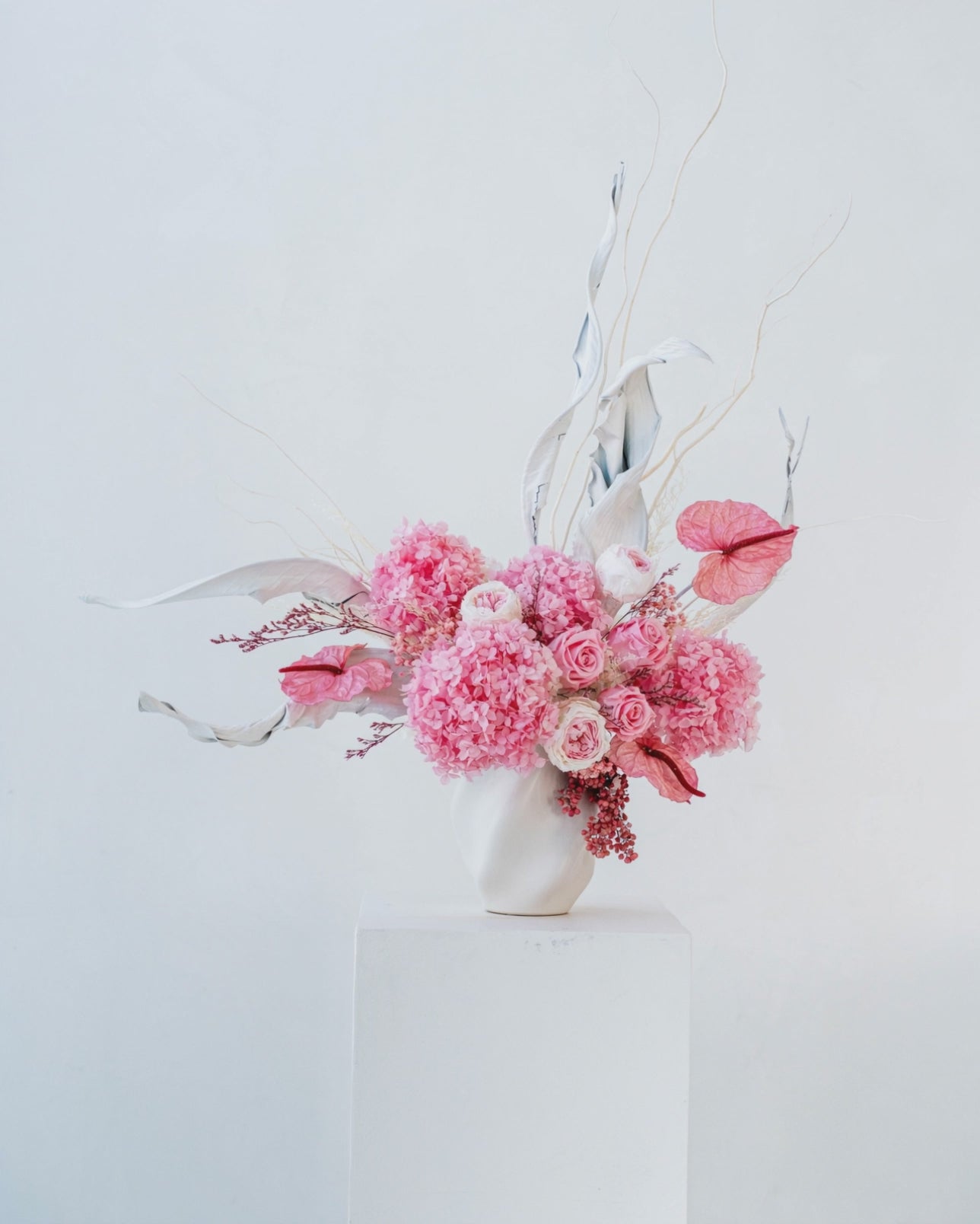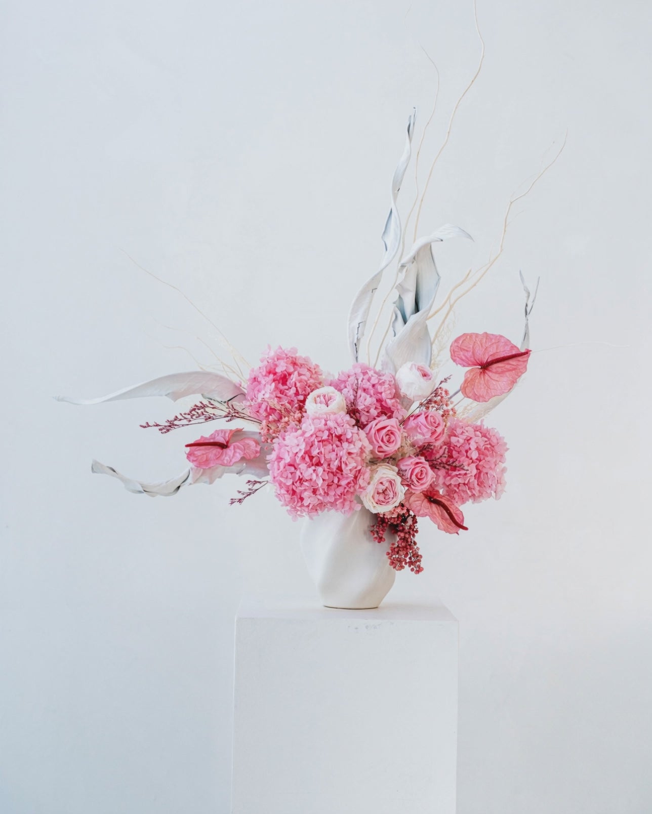 An everlasting natural preserved arrangement that lasts for years. Features two lush pink hydrangeas, three timeless bi color  garden roses, three premium pink roses sculptural  three Anthuriums, complemented by delicate preserved  Strelitzia leaf  that add depth and movement.