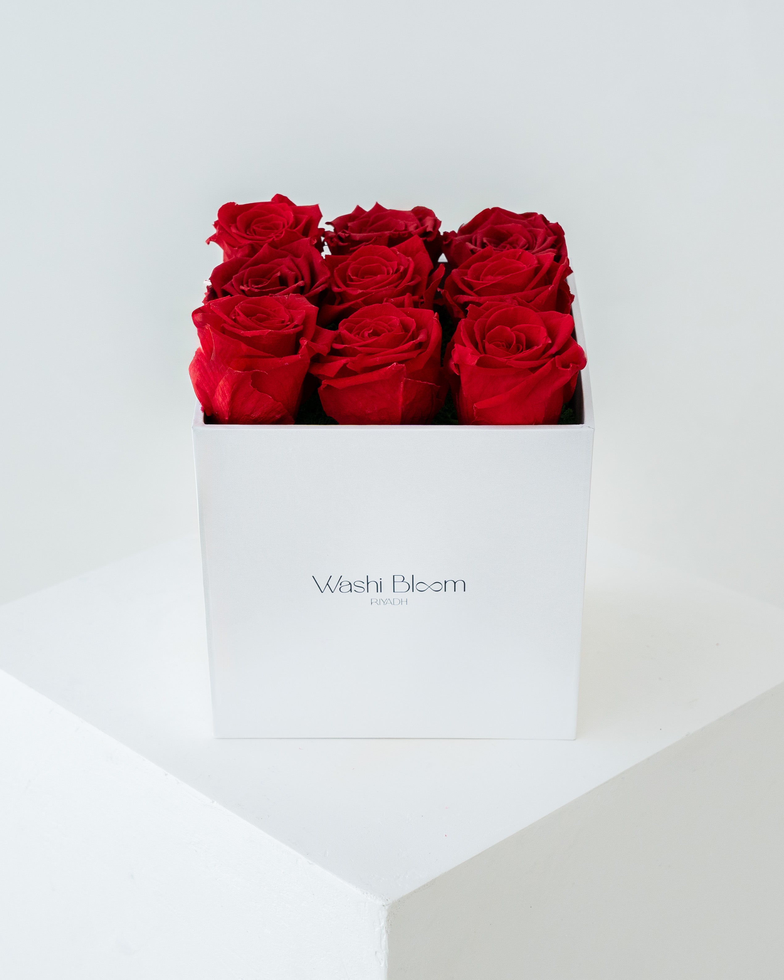 تشكيلتنا المميزة من الصندوق الأبيض الفاخر بتسع ورود طبيعية دائمة تعيش لأكثر من سنة من الروز الأحمر. تعكس الحب الأبدي والفخامة، حيث تحتفظ بجمالها لمواسم طويلة، مما يجعلها الهدية الأمثل لحب لا يفنى أبدًا.