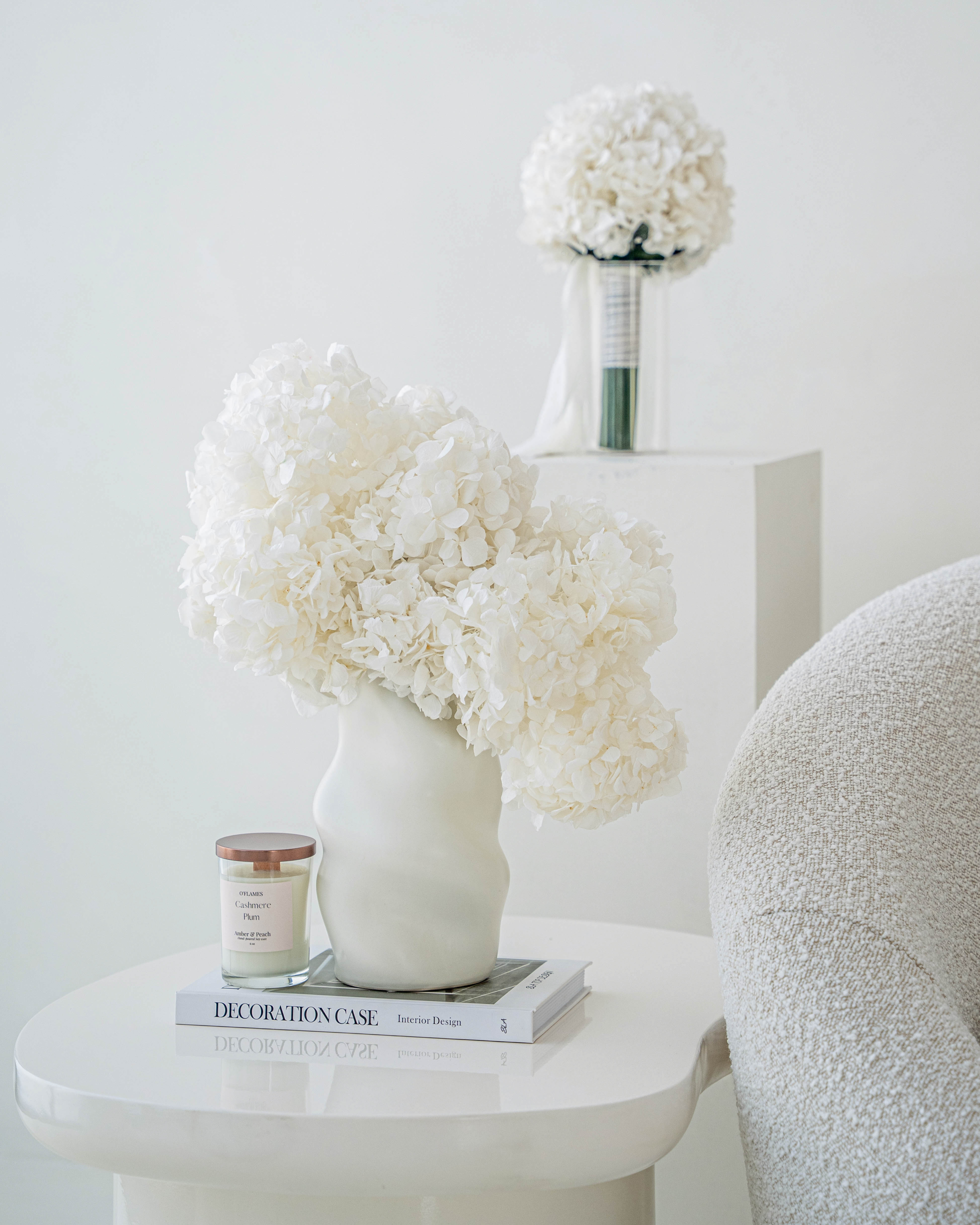 Minimal yet striking, this design celebrates the pure beauty of everlasting white hydrangeas, cloud-like clusters that bring softness and serenity to any space.